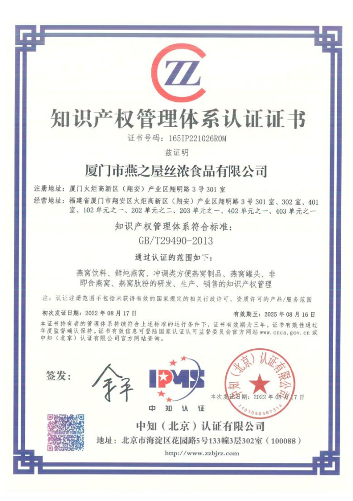 此外,2022年6月,燕之屋成立“知識產(chǎn)權(quán)管理小組”,深入實(shí)施知識產(chǎn)權(quán)強(qiáng)企戰(zhàn)略。同年8月,燕之屋通過前期的知識產(chǎn)權(quán)管理現(xiàn)狀診斷、構(gòu)建知識產(chǎn)權(quán)管理體系,并通過內(nèi)部自查調(diào)整、經(jīng)過內(nèi)審會議以及管理評審不斷進(jìn)行完善體系,最終由中知(北京)認(rèn)證有限公司對燕之屋主體進(jìn)行外部現(xiàn)場審核認(rèn)證,順利通過國標(biāo)《企業(yè)知識產(chǎn)權(quán)管理規(guī)范》(GB/T29490-2013)的貫標(biāo)認(rèn)證,獲得知識產(chǎn)權(quán)管理體系認(rèn)證證書,標(biāo)志著燕之屋在知識產(chǎn)權(quán)規(guī)范化管理、知識產(chǎn)權(quán)運(yùn)用、知識產(chǎn)權(quán)保護(hù)等方面達(dá)到國內(nèi)燕窩行業(yè)前沿水平。今年1月,國家知識產(chǎn)權(quán)局公布2023年度國家知識產(chǎn)權(quán)優(yōu)勢企業(yè)評定結(jié)果,燕之屋憑借行業(yè)內(nèi)先進(jìn)的研發(fā)創(chuàng)新實(shí)力、完備的知識產(chǎn)權(quán)管理體系以及突出的知識產(chǎn)權(quán)管理水平,成功榮獲“國家知識產(chǎn)權(quán)優(yōu)勢企業(yè)”稱號,自主知識產(chǎn)權(quán)能力贏得權(quán)威認(rèn)可。