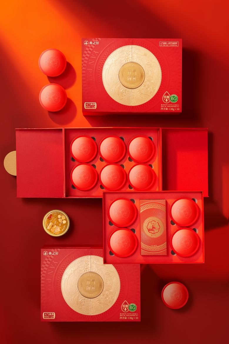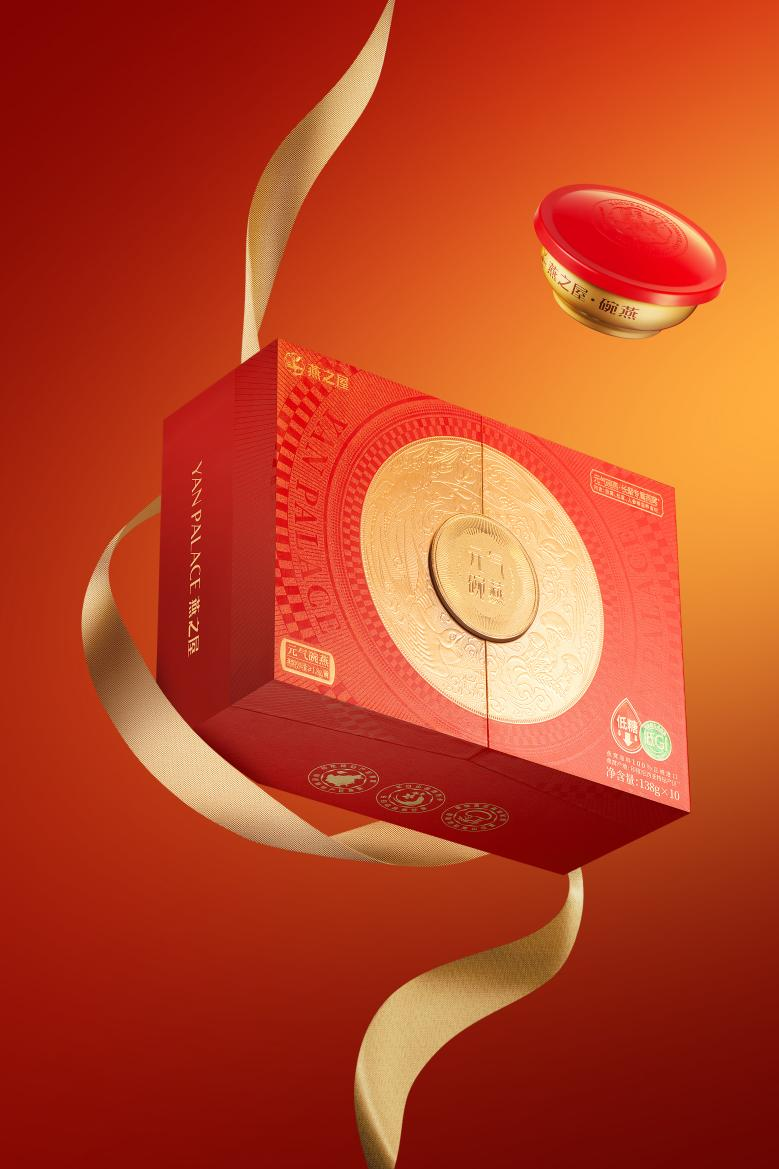 碗燕·元?dú)饪畈捎弥袊?guó)紅與黃金色系的精美配搭,凸顯光亮色澤與尊貴質(zhì)感,大方得體,有禮有面,作為母親節(jié)禮物盡顯尊貴格調(diào)。禮盒設(shè)計(jì)圍繞“圓”的概念,以年輪為設(shè)計(jì)意象,象征歲月賦予的智慧,也傳遞著圓滿之意。盒上刻畫金燕反哺動(dòng)人圖景,祥云繁花環(huán)繞其中,蘊(yùn)藏濃厚情意。獨(dú)特的對(duì)稱開盒頗具巧思與創(chuàng)意,內(nèi)里雙層設(shè)計(jì),共承十碗珍饈碗燕·元?dú)饪?,滿載濃濃營(yíng)養(yǎng)與深切關(guān)懷,讓滋補(bǔ)觸手可及,關(guān)愛無處不在。