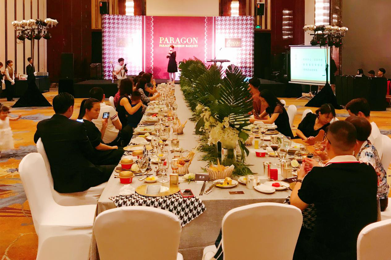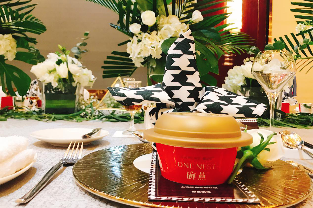 本次晚宴在布置設(shè)計(jì)上下了極大的功夫,宴會(huì)廳以維多利亞時(shí)代風(fēng)潮為背景,融合了時(shí)髦摩登的現(xiàn)代感和簡約優(yōu)雅的古典風(fēng)格,給嘉賓們帶來了雙重潮流風(fēng)尚體驗(yàn)。熱情的花藝系與千鳥格鋪滿場館,輕重材質(zhì)拼接交錯(cuò),詮釋了當(dāng)下優(yōu)雅與磐基名品中心的品牌基調(diào)。晚宴一角,設(shè)置有燕之屋碗燕專區(qū),錯(cuò)落有致的產(chǎn)品陳列,也為晚宴的氛圍再添一筆亮色,吸引不少來賓就圍觀咨詢。