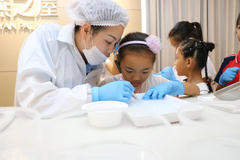圖:燕之屋員工子女在工作人員帶領(lǐng)下體驗(yàn)燕窩挑毛環(huán)節(jié)