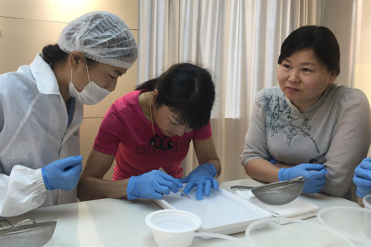 圖:燕之屋直銷部VIP客戶在挑毛女工指導(dǎo)下體驗(yàn)挑毛