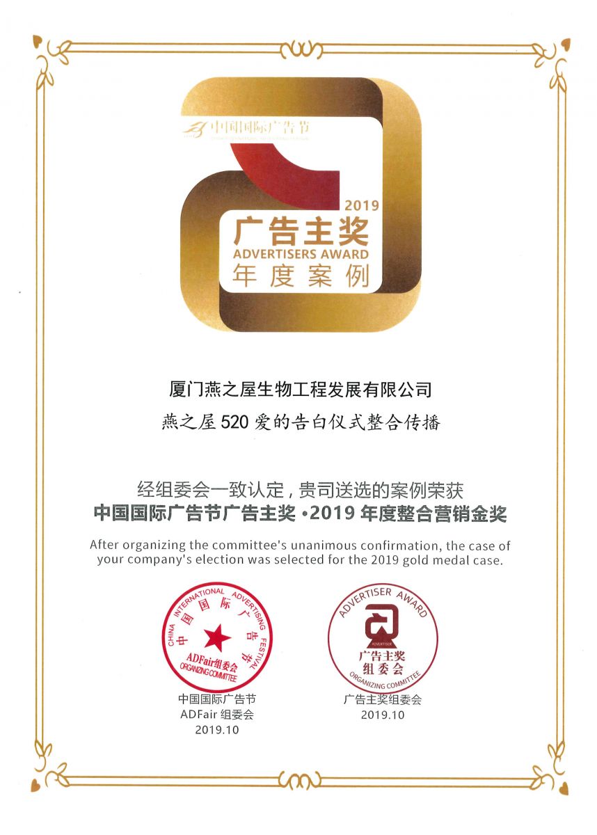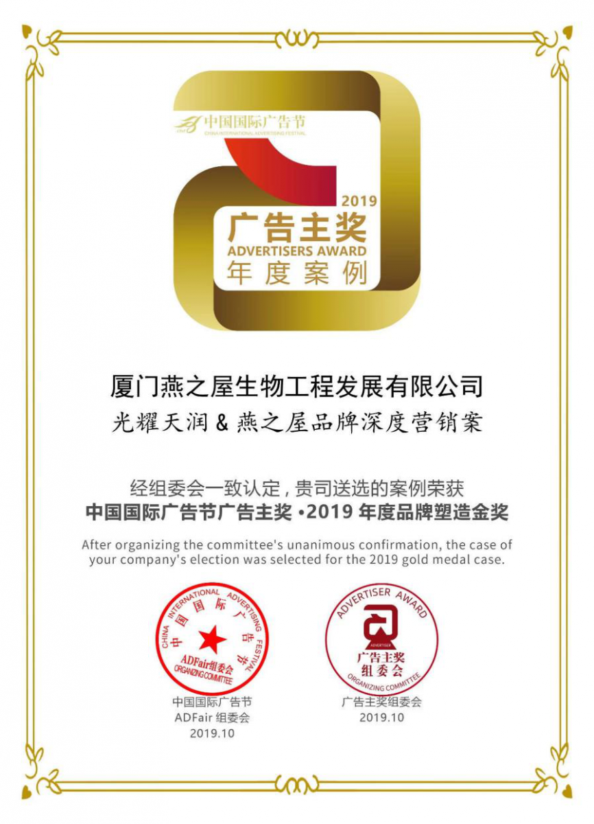 10月25日—28日,第26屆中國國際廣告節(jié)在江西南昌盛大開幕。在同步舉辦的“2019中國國際廣告節(jié)廣告主獎(jiǎng)”評選活動中,由燕之屋選送的《光耀傳媒&燕之屋品牌深度營銷案》及《燕之屋520愛的告白儀式整合傳播》憑借出色的整合營銷能力、綜合把控能力等突出表現(xiàn),分獲“2019年度品牌塑造金獎(jiǎng)”、“2019年度整合營銷金獎(jiǎng)”兩項(xiàng)大獎(jiǎng)。