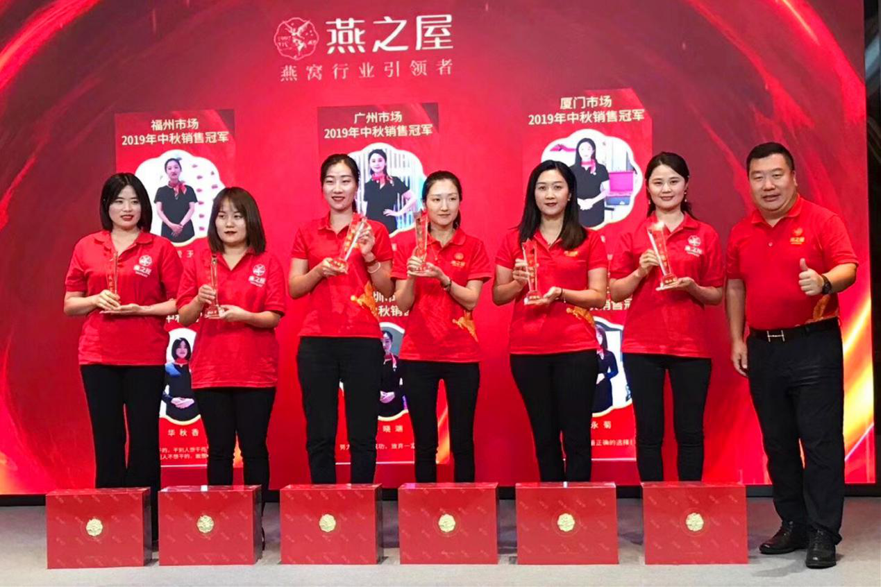 圖:燕之屋執(zhí)行董事兼總裁李有泉(右1)為直營市場中秋銷售冠軍頒獎(jiǎng)