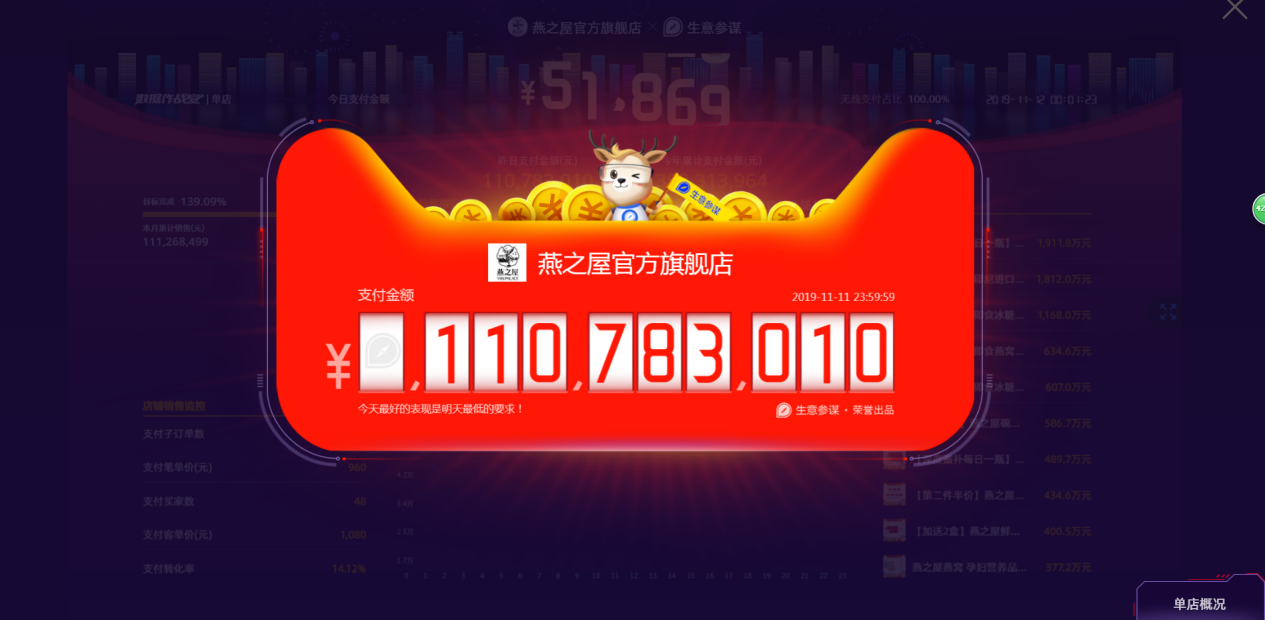 圖:燕之屋2019雙11全網(wǎng)成交額破億