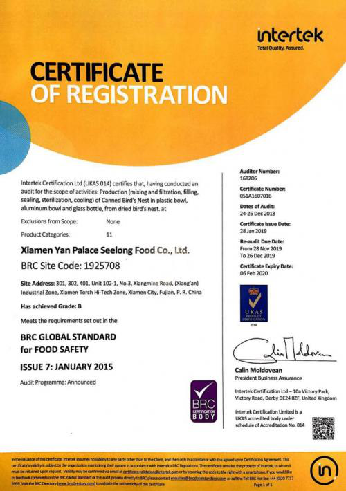 2017年,燕之屋全線產(chǎn)品通過BRC全球食品安全標(biāo)準(zhǔn)認(rèn)證,不僅標(biāo)志著燕之屋取得出口歐盟的通行證,獲得了進入國際市場的敲門磚,還彰顯了其燕窩品質(zhì)和實力水平,在食品品質(zhì)與安全上得到了極高的肯定。更高水準(zhǔn)、國際標(biāo)準(zhǔn)的監(jiān)督與反饋,讓燕之屋的燕窩產(chǎn)品、生產(chǎn)基地、服務(wù)售后始終領(lǐng)先于行業(yè)標(biāo)準(zhǔn),成為燕窩行業(yè)的"品質(zhì)名片",也正是燕之屋對自己嚴(yán)標(biāo)準(zhǔn)、高要求的實力見證。
