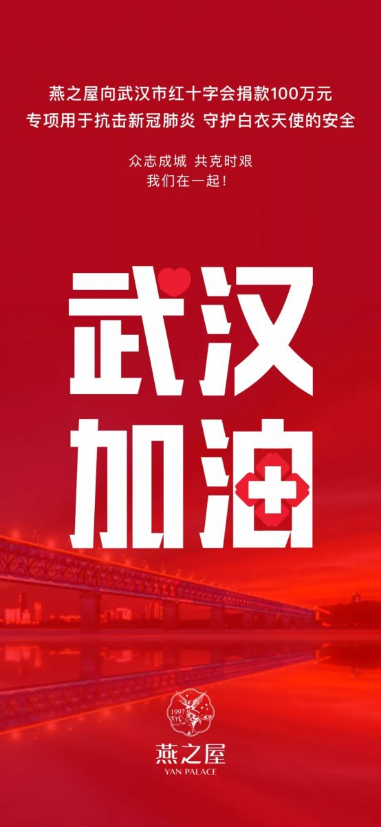 為了更好地守護白衣天使的安全,也為疫情的防控與治療盡一份力量,1月26日,在與當?shù)叵嚓P(guān)機構(gòu)全面溝通后,燕之屋向武漢市紅十字會捐款首批100萬元,專項用于武漢前線抗擊及防治疫情工作,包括醫(yī)療用品等急需物資的采購,守護一線醫(yī)療人員的工作安全。與此同時,燕之屋也面向企業(yè)內(nèi)部發(fā)起倡議,呼吁全體員工多方助力,共同抗擊肺炎疫情。