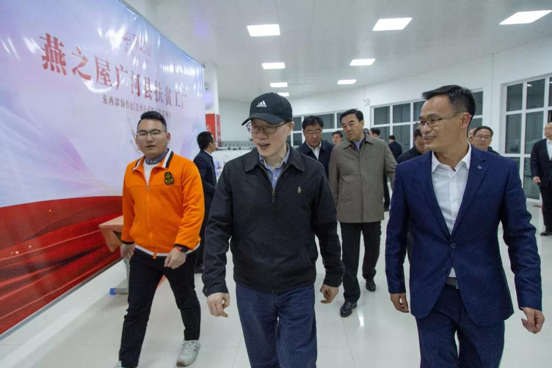 圖:2019年10月22日,國臺(tái)辦主任劉結(jié)一(中)蒞臨燕之屋廣河縣扶貧工廠考察