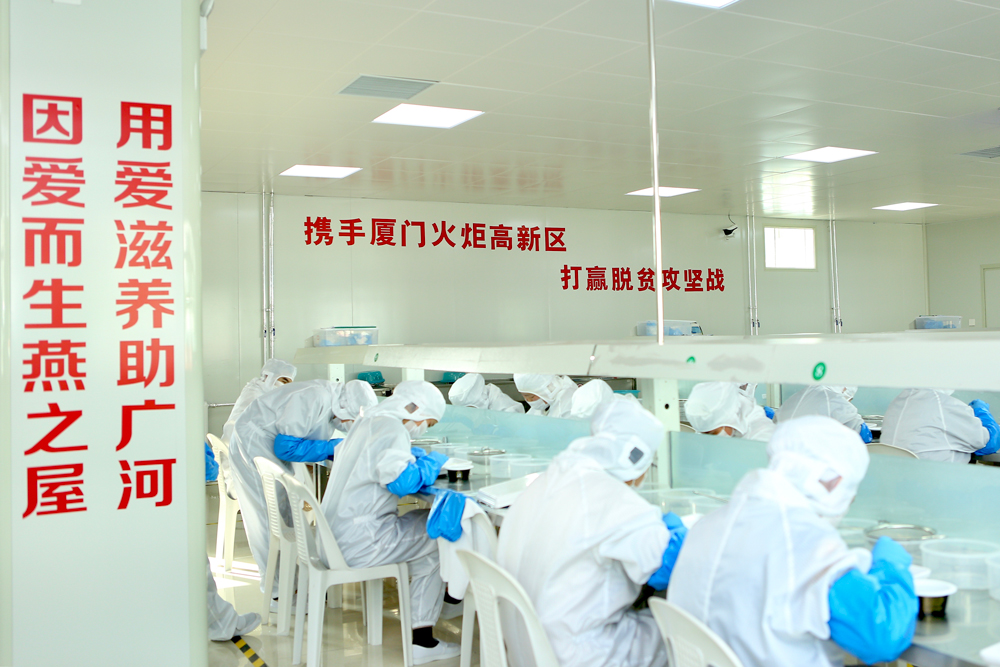 在燕之屋扶貧工廠干凈衛(wèi)生的高標(biāo)準(zhǔn)無塵車間里,當(dāng)?shù)貑T工主要從事燕窩挑揀工作,經(jīng)過嚴(yán)苛的專業(yè)技能培訓(xùn)后再安排上崗就業(yè)。在全體員工的共同努力下,2020年1月,燕之屋廣河縣工廠總計(jì)完成119kg燕窩產(chǎn)量,是2019年9月至12月的總和;2020年3月完成176kg產(chǎn)量,6月產(chǎn)量更有望突破300kg。